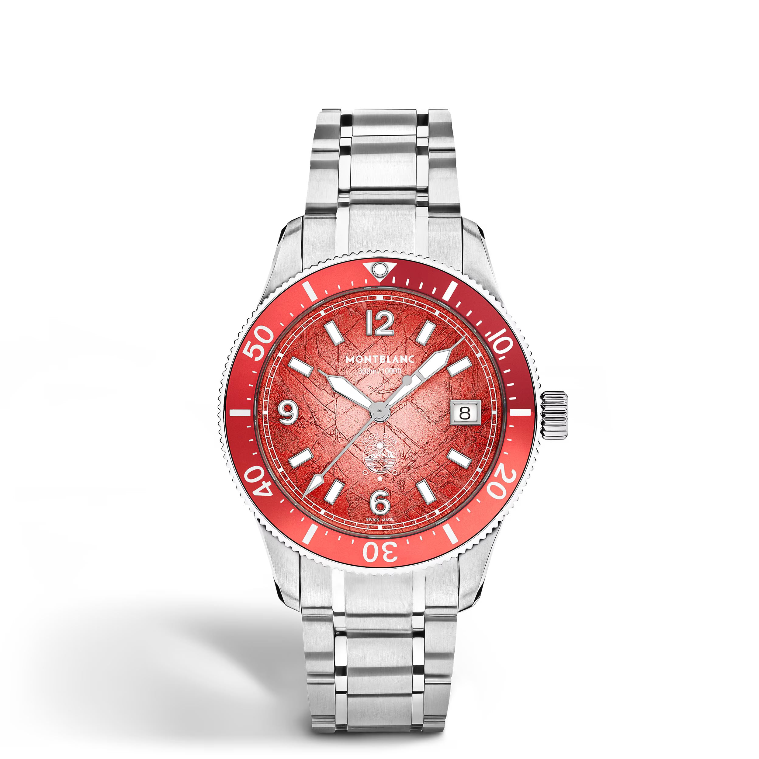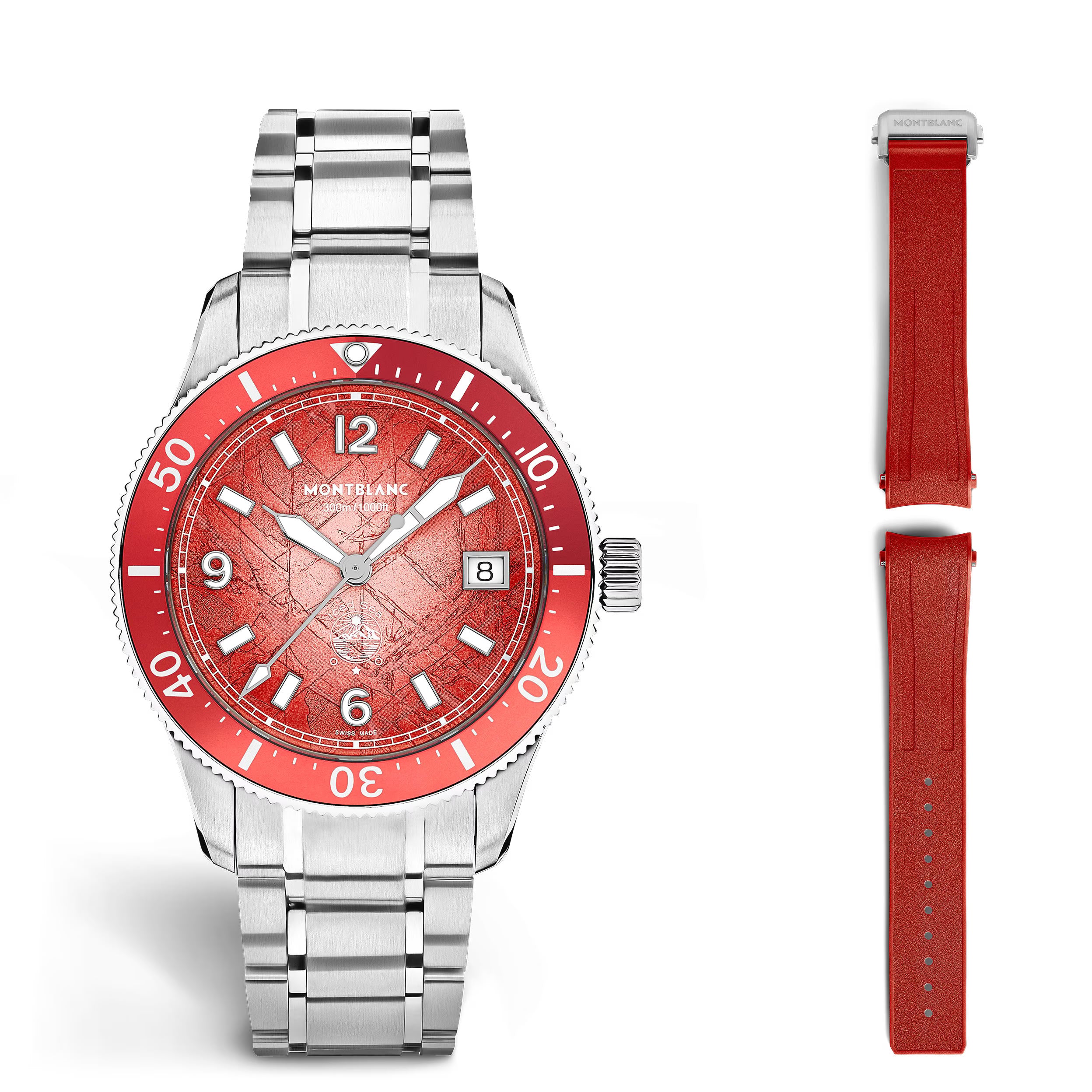 萬寶龍 Iced Sea 日期顯示自動腕錶 0 Oxygen 限量版採用珊瑚色墨暈冰川圖案錶盤,給人一種深入冰川深處的印象。受蒙特維冰河的啟發,這種冰川紋理使用一種幾乎被遺忘的「gratté-boisé」古典工藝技術製作。腕錶採用完全隔絕氧氣的 38 毫米精鋼錶殼,配備內嵌雙色珊瑚色陽極氧化鋁的單向旋轉錶圈,錶背刻有 3D 鐫刻圖案。這款限量版腕錶限量發行 300 枚,配有可調節的精鋼替換錶鍊和珊瑚紅色橡膠錶帶,無需返回專賣店或使用任何工具即可快速輕鬆地更換。這款腕錶符合 ISO 6425 水肺潛水標準,防水深度達 300 公尺。
