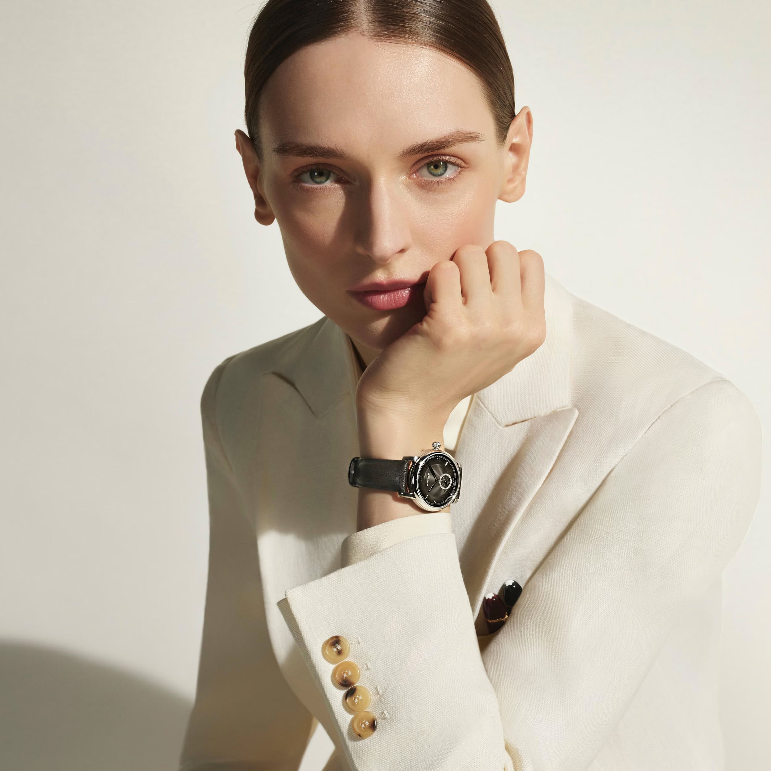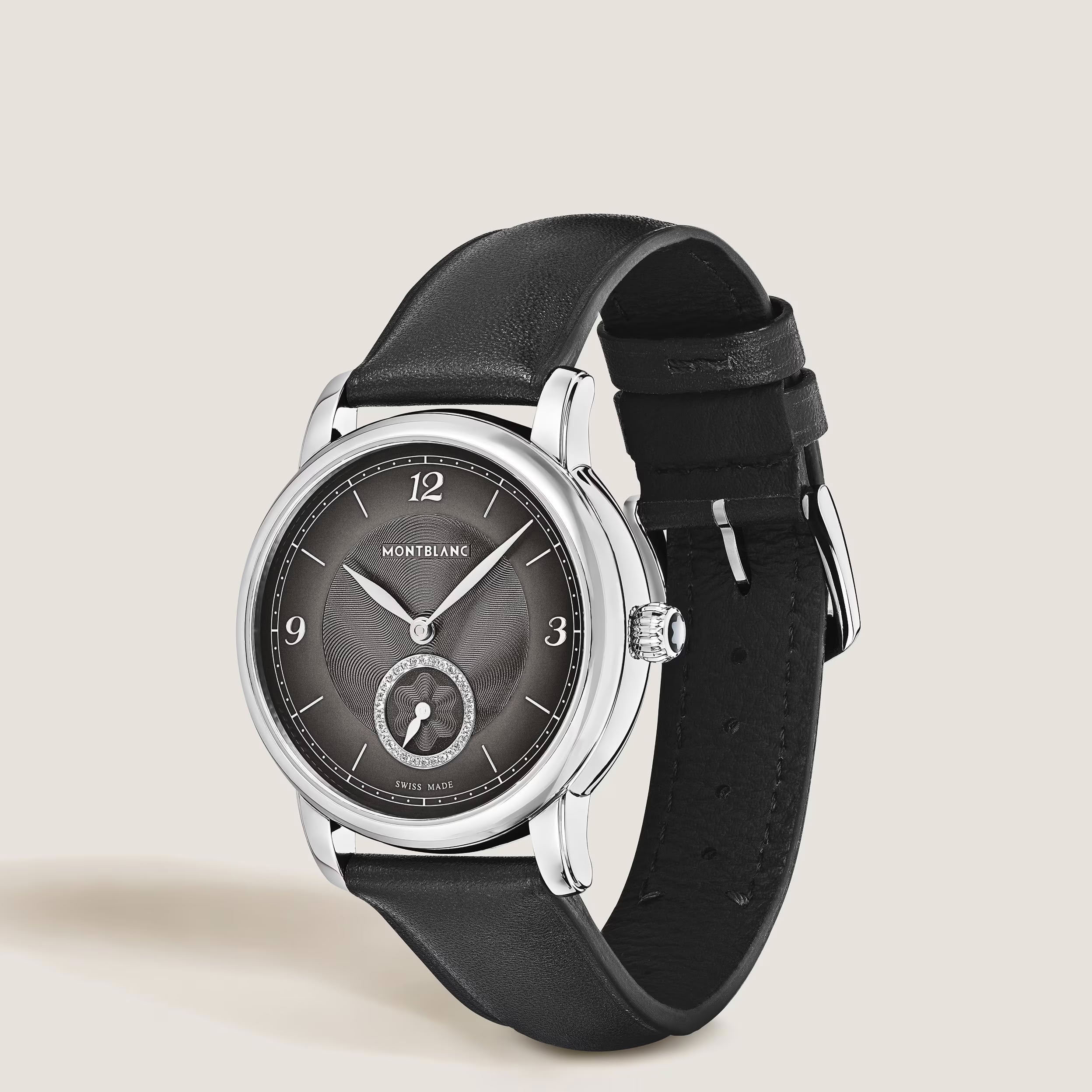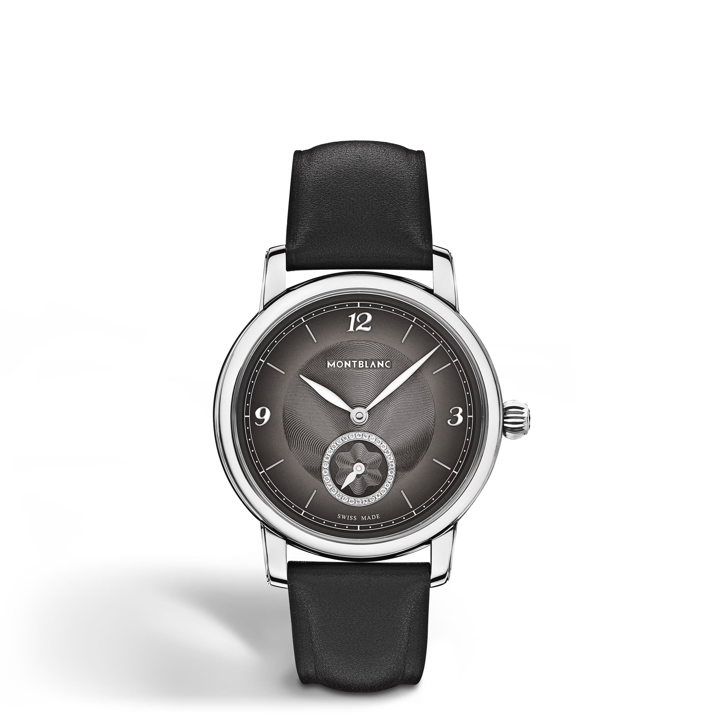萬寶龍明星傳承系列小秒針自動腕錶,將品牌最精緻的設計特色提升至新的優雅層次。腕錶配有墨暈煤灰色錶盤,搭配放射星形扭索飾紋、細刻浮雕、鍍銠阿拉伯數字、葉形指針,以簡約而優雅的方式顯示小時、分鐘、秒鐘,秒鐘計時盤鑲飾 30 顆明亮式切割鑽石(約 0.06 克拉)。腕錶搭載 MB 24.16 自動機芯,採用 36 毫米精鋼鵝卵石形錶殼,並配有透明錶背,展示飾有萬寶龍標誌的擺陀。黑色小牛皮錶帶由萬寶龍藝術總監 Marco Tomasetta 特別設計,以品牌的書寫工具造型尖銳的筆尖為靈感。