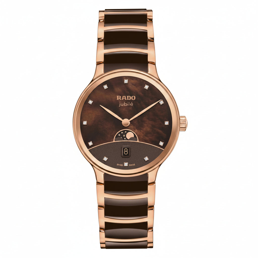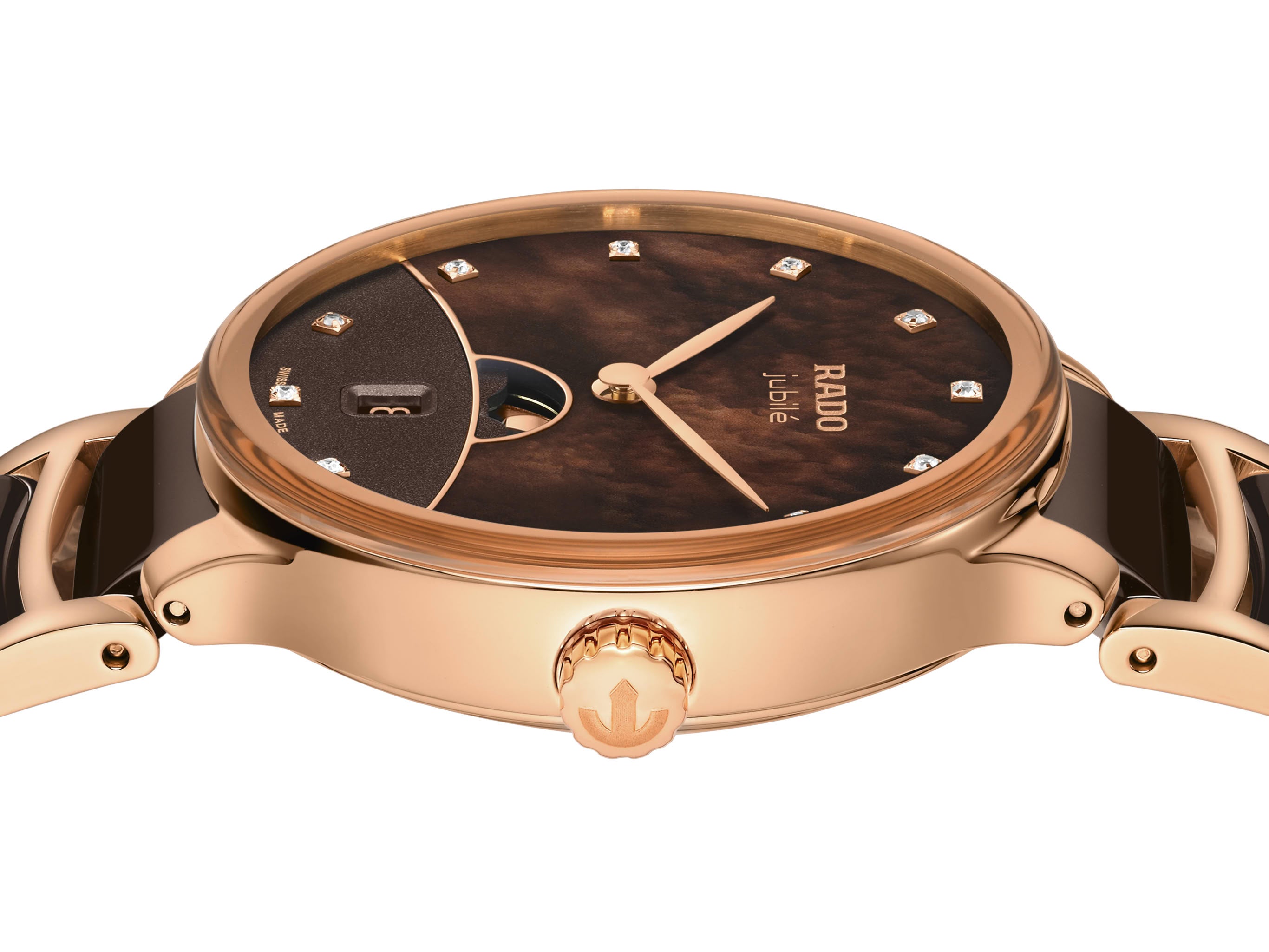 Rado 瑞士雷達表 Centrix 晶萃系列月相腕錶,同時度量時間與月相的流轉,為 Rado 瑞士雷達表系列增添一款永恆之作。雙面防反光塗層弧形藍寶石水晶錶鏡與高科技陶瓷錶鏈中央鏈節,使腕錶堅固耐用。Rado 瑞士雷達表高科技材質讓腕錶始終如新。 以地球圖案、棕色珍珠母貝天空、玫瑰金色澤地平線及月相複雜功能構成的錶盤,堪稱真正的藝術作品。一只經拋光處理的立體月相顯示在錶盤上格外突出。外觀點綴 12 顆頂級威塞爾頓 VS-SI 淨度鑽石,更臻完美。 棕色高科技陶瓷錶鏈中央鏈節貼合您的肌膚。腕錶兼具舒適佩戴感與耐用性。玫瑰金色澤裝飾細節完善整體造型。這款腕錶注定引人注目。 Rado瑞士雷達表R084型石英機芯,配備兩針、日期及月相顯示功能,確保腕錶走時精準可靠。