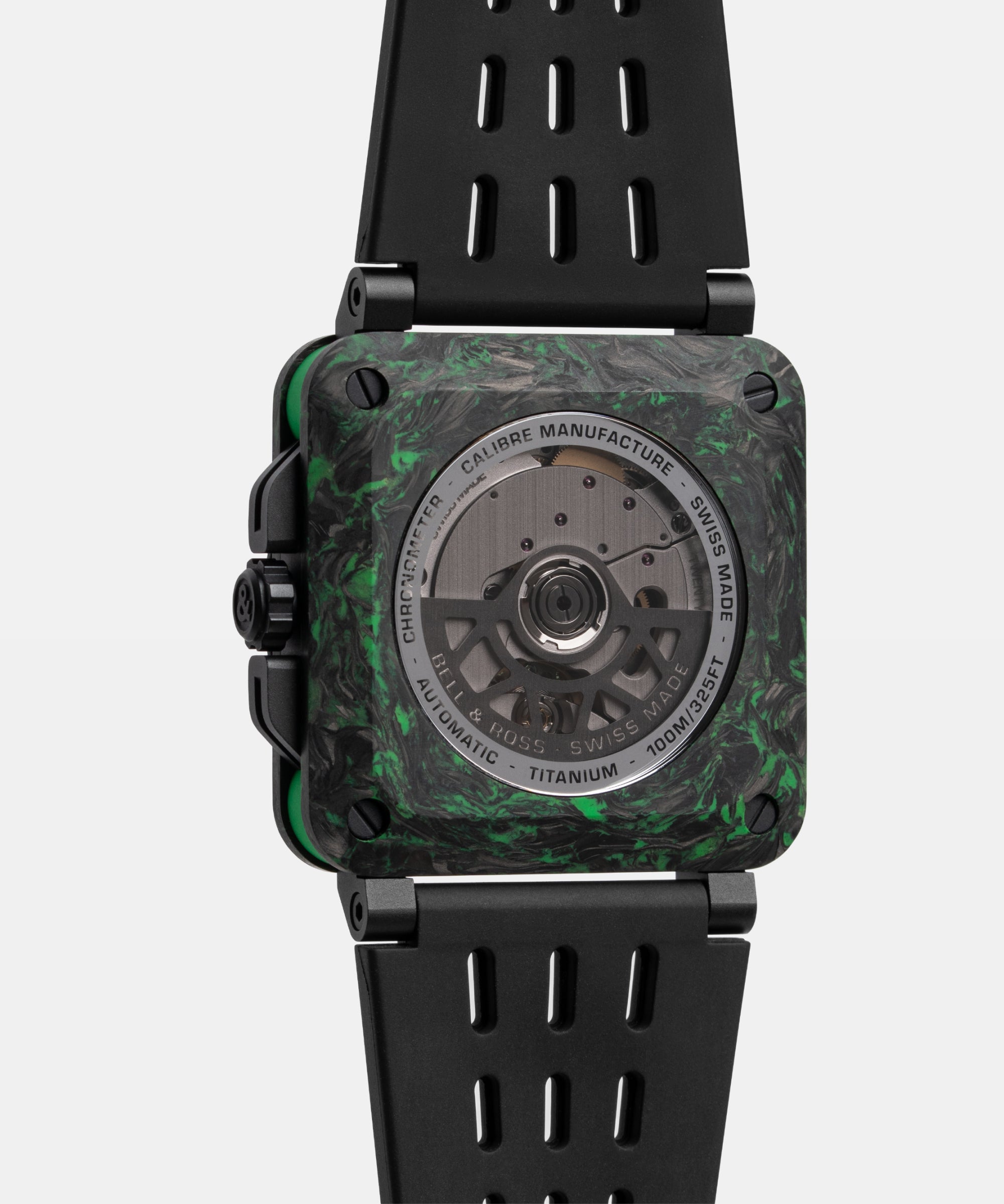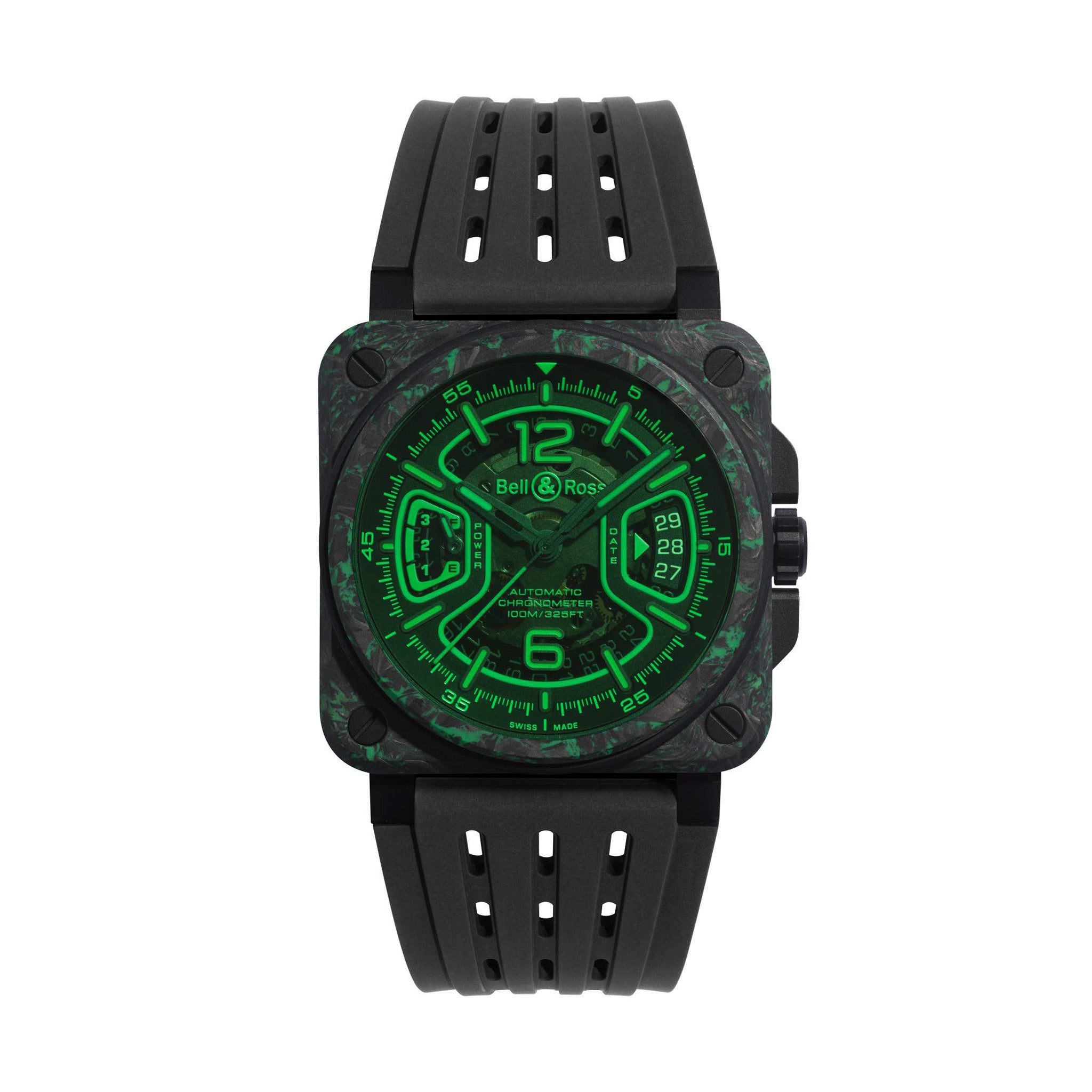 BR-X3 Night Vision 錶殼結合了 LUM-CAMO——一種融合 碳纖維 與 發光樹脂 的高科技複合材質——以及 黑色 PVD 鈦金屬 和 綠色發光橡膠圓柱體,提供 卓越的耐用性 與 極佳的可讀性,即使在完全黑暗中亦清晰可見。其 鏤空錶盤 以 綠色 X 標記 突出,並由 煙燻藍寶石水晶 保護,展示了 自動機芯,靈感源自 航空用抬頭顯示器 (HUD),確保 日夜皆能瞬間讀時。