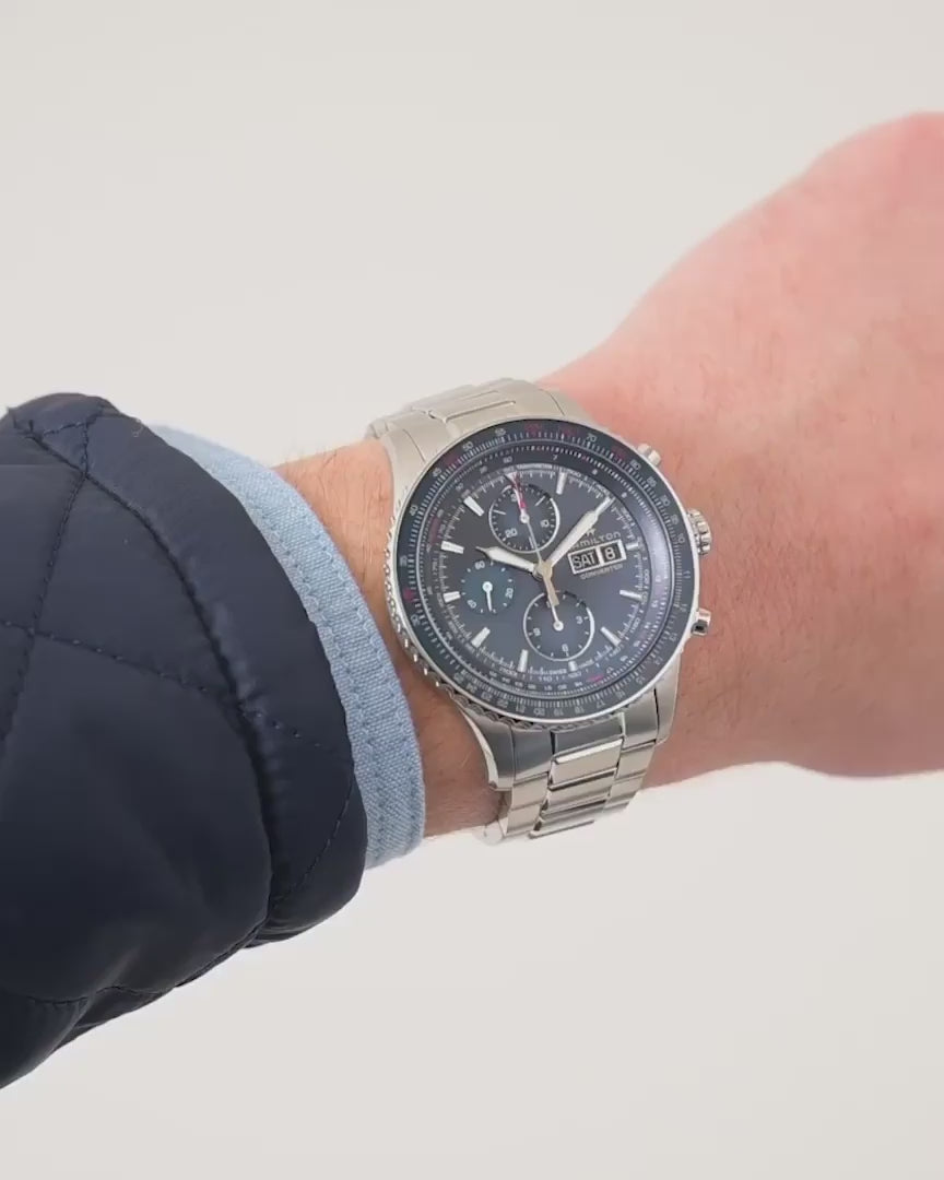 卡其航空系列Converter自動上鍊計時碼錶設有雙向旋轉滑尺錶圈,瞬間即可完成重要的計算和公制換算。此款飛行員腕錶搭載配備矽游絲的H-21-Si機芯,性能和精準度更進一步,完美結合功能和航空美學: 44毫米精鋼錶殼配有精鋼錶鍊,藍色錶盤予人晴空意象。