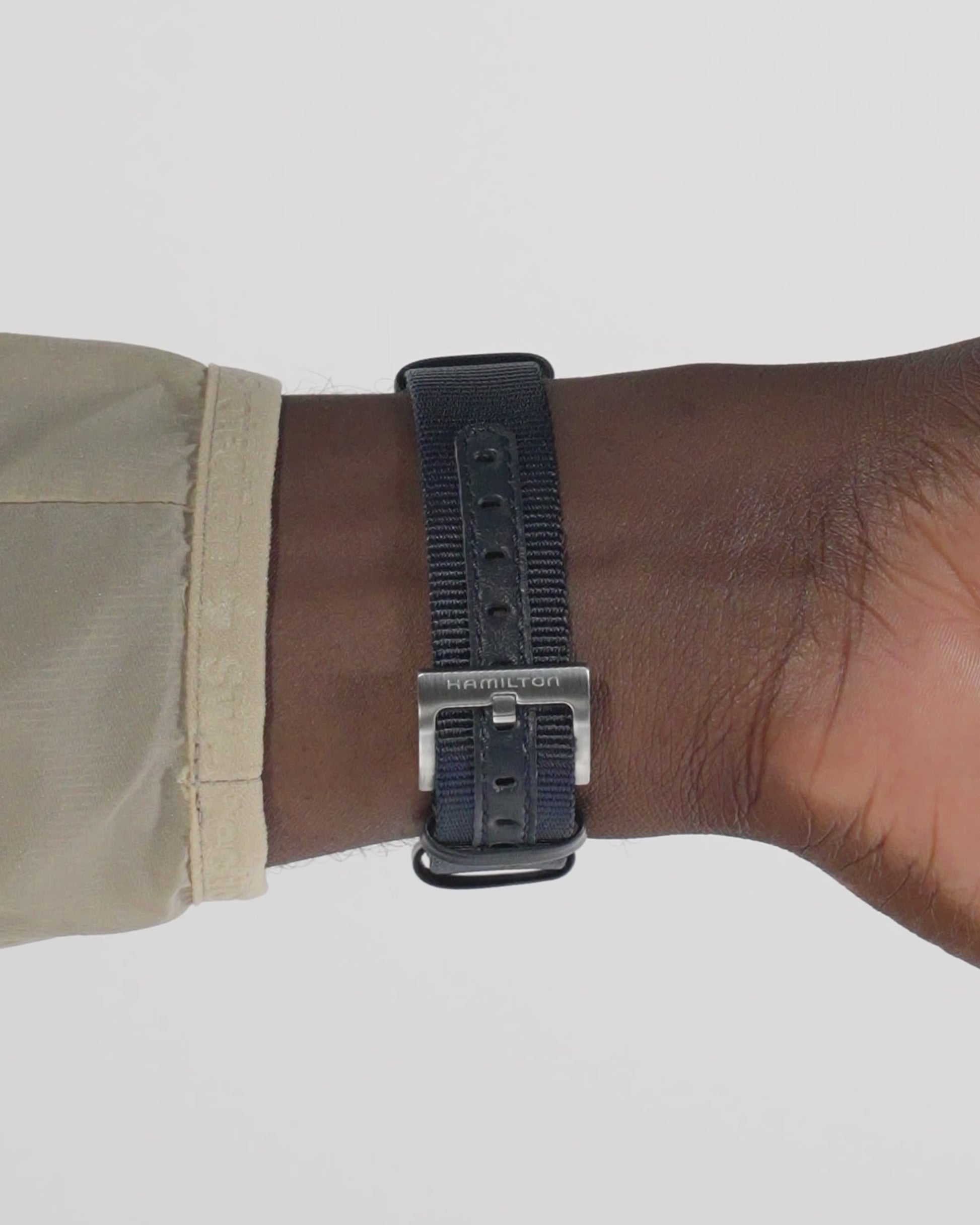 卡其陸戰系列石英腕錶採用簡約的設計風格,回歸至漢米爾頓腕錶的軍事傳統。錶盤採用清晰可見的字體、更為筆直的阿拉伯數字時標及「鐵路」分鐘軌,搭配低調時尚的藍色錶盤,設有白色Super-LumiNova®夜光塗層時標。這款腕錶隨附一條藍色織物NATO錶帶配藍色皮革環圈——非常適合您的下一次戶外歷險。