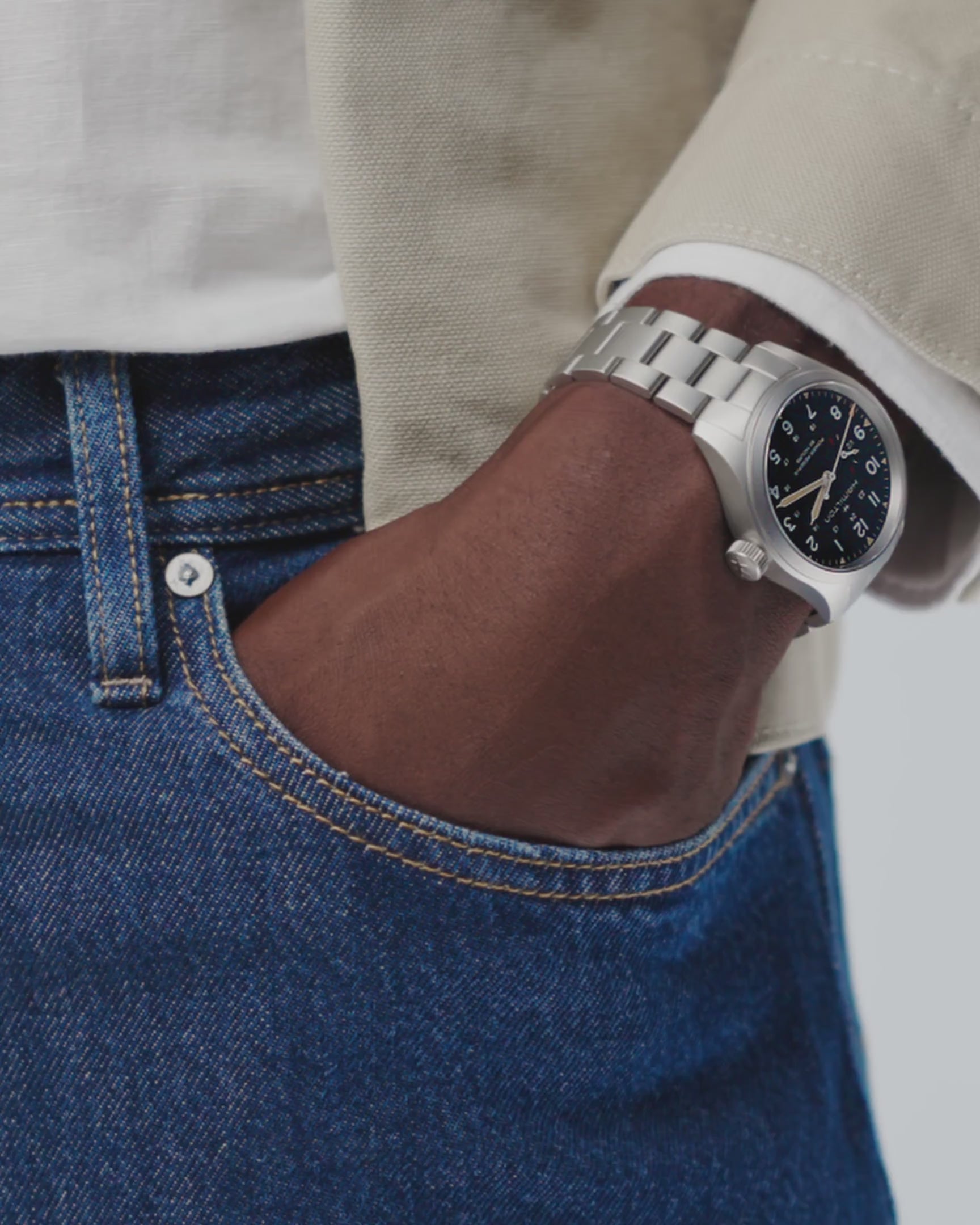 卡其陸戰系列動力儲存機械腕錶40毫米款,在致敬系列雋永設計與實用功能的同時,亦巧妙展示現代性能與創新製錶技術。腕錶搭載由ETA專為漢米爾頓研發的H-23手動上鍊機芯,首次可透過錶盤直接讀取80小時動力儲存。腕錶配備精鋼錶鍊,黑色錶盤綴有「power reserve 80 hours(80小時動力儲存)」字樣,帶有「F」(動力充足)及「E」(動力不足)標示,彰顯此功能的卓越實用性。