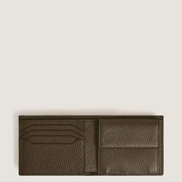 這款袖珍皮夾將低調優雅與日常實用性融為一體。設 1 個翻蓋零錢口袋、4 個信用卡隔層、 2 個鈔票隔層、 1 個零錢袋,以及 1 個存放收據的附加口袋。採用高級的卡其色小牛皮製成,飾有經典萬寶龍標誌,是精緻又實用的配件。