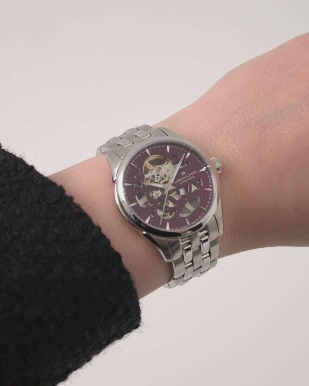 爵士系列36毫米鏤空腕錶,具有紫色鏤空錶盤,揭示時計內部機械結構的美妙之處,讓精準性能成為焦點。爵士系列鏤空腕錶搭載H-10-S自動上鍊機芯,動力儲存達80小時,設有Nivachron™擺輪游絲,搭配精緻的精鋼錶鍊,彰顯漢米爾頓不斷進化的工藝和對細節的講究。
