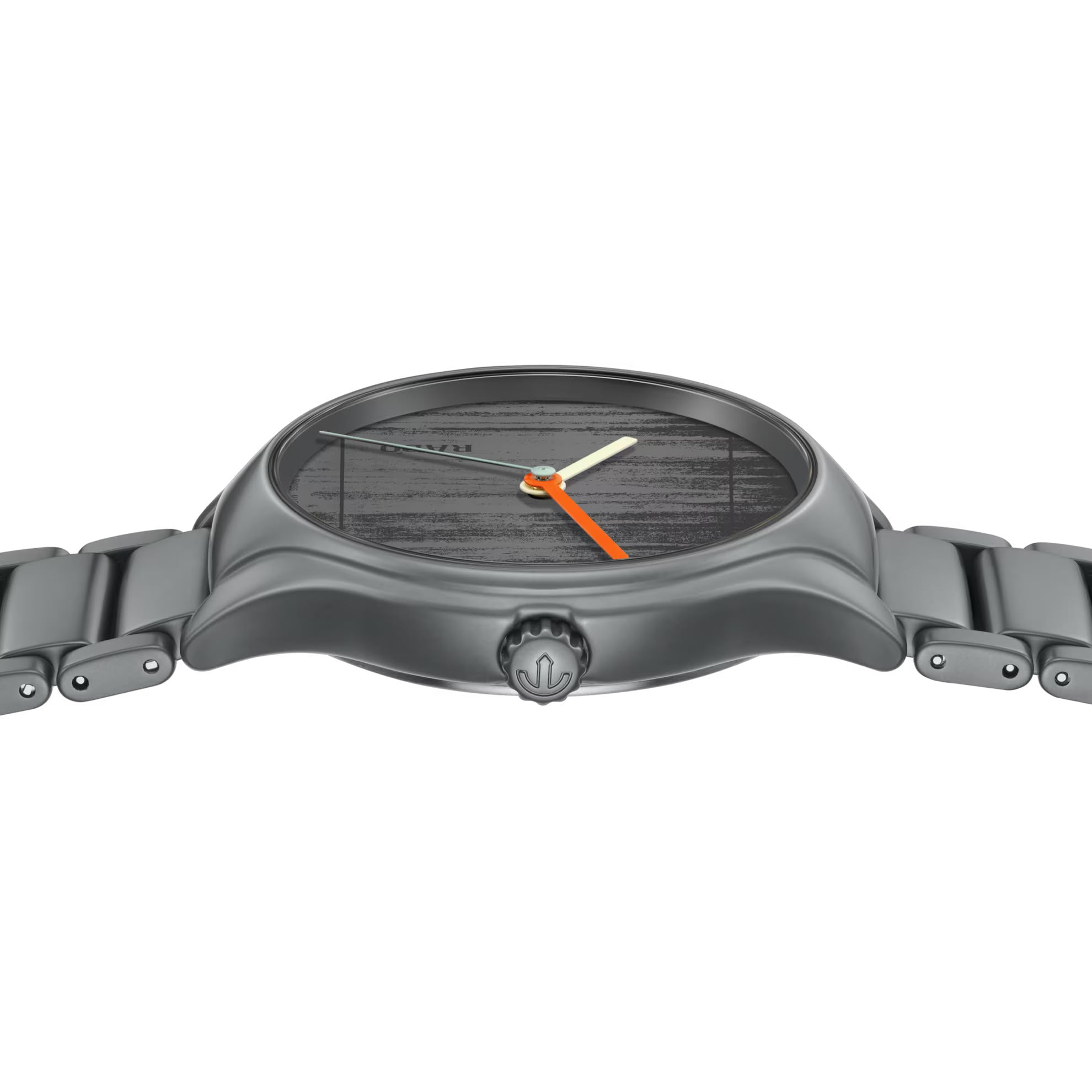 霧面GRIS FONCÉ(32010)色調的高科技陶瓷鍊帶與一體成型錶殼,完美呼應現代建築之父勒·柯比意(Le Corbusier)《建築色彩學》中的經典色彩,再次印證Rado作為「材質大師」(Master of Materials)的地位,同時也確保佩戴舒適性。 弧形藍寶石水晶鏡面與高科技陶瓷使腕錶歷久彌新。雙面防反光塗層讓錶盤細節清晰可見,錶盤以雷射雕刻描繪美國劍橋「卡本特視覺藝術中心」(Carpenter Center for the Visual Arts)混凝土表面的抽象紋理。Rado標誌垂直設於8點鐘位置。指針巧妙運用《建築色彩學》中的其他顏色,形成鮮明對比,包括BLANC(32001)、ORANGE VIF(4320S)與VERT ANGLAIS CLAIR(32041)。 腕錶搭載Rado R763型自動機芯,具備80小時動力儲存及Nivachron™抗磁游絲。機芯經五個方位測試和調校,超越標準測試要求,確保穩定可靠與精準走時。