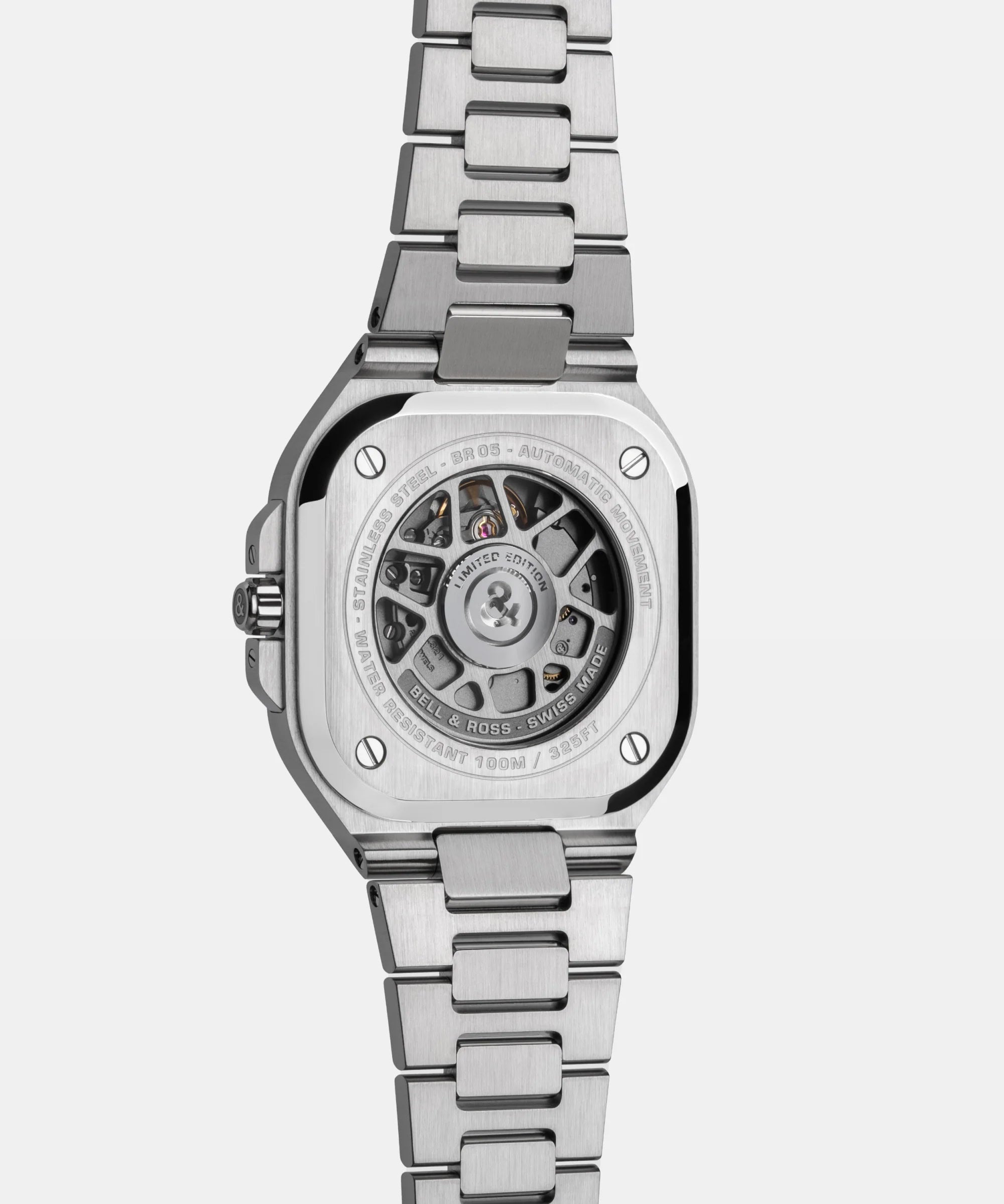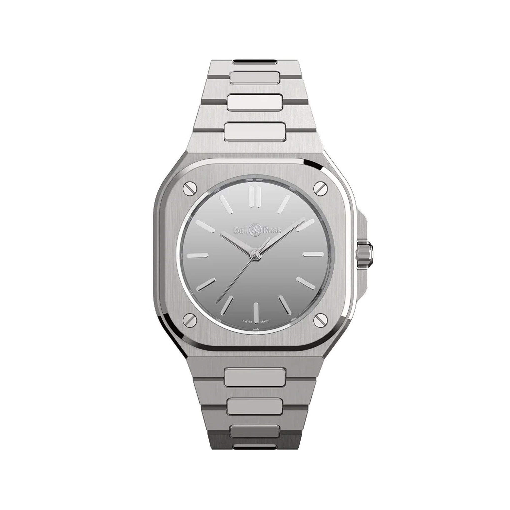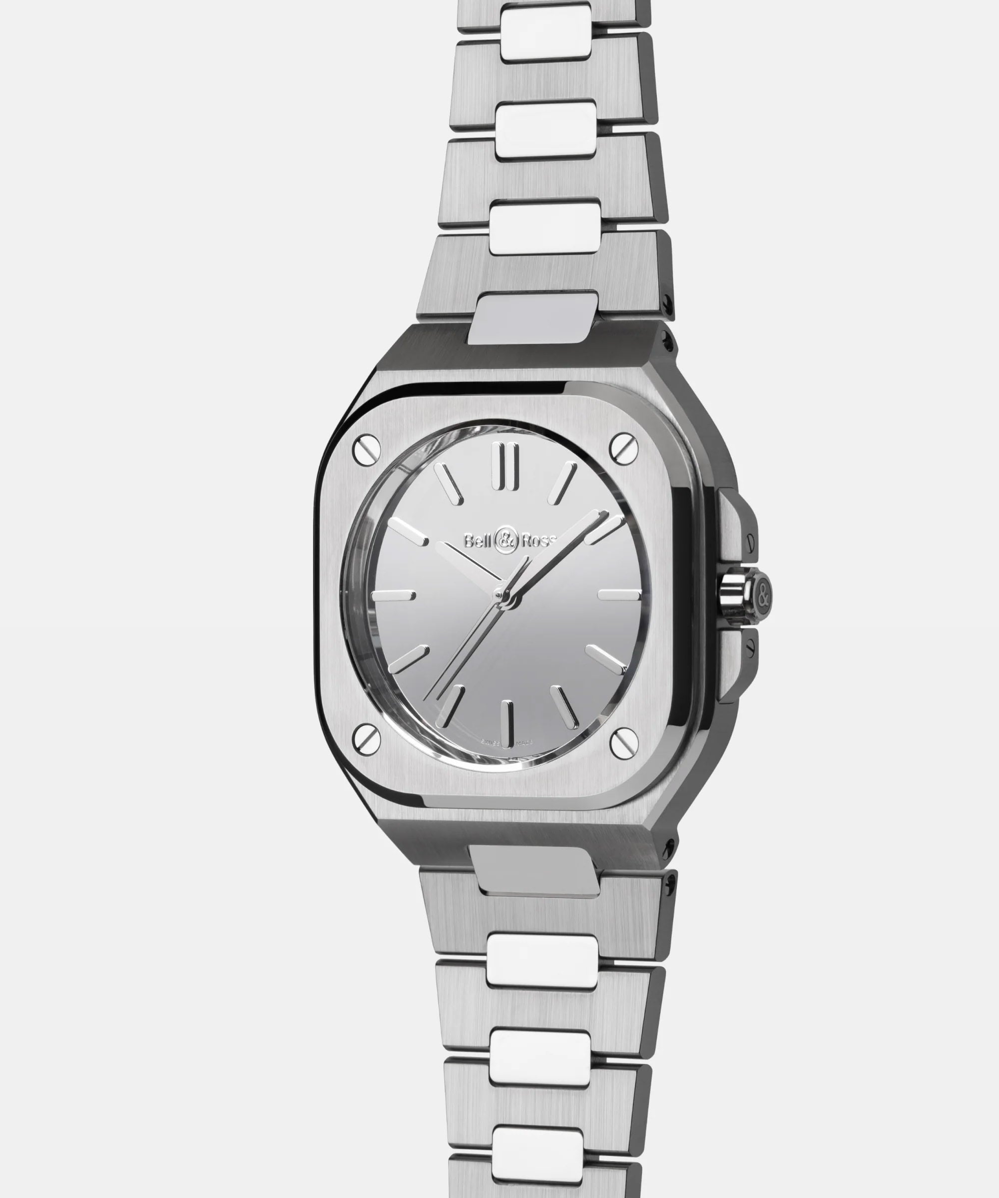 BR-05的整合設計展現獨特個性:錶帶與錶殼融為一體,勾勒出一體成形的面貌。 40毫米錶殼上的表面修飾更吸引眾人目光。緞面打磨表面光滑平整,拋光斜角則凸顯輪廓並增添份量感。緞面打磨與拋光交錯表面從錶殼一路延伸到彎曲自如的不鏽鋼鍊帶。鍊節根據彎曲半徑鉸接而成,確保錶鏈舒適貼合任何手腕。