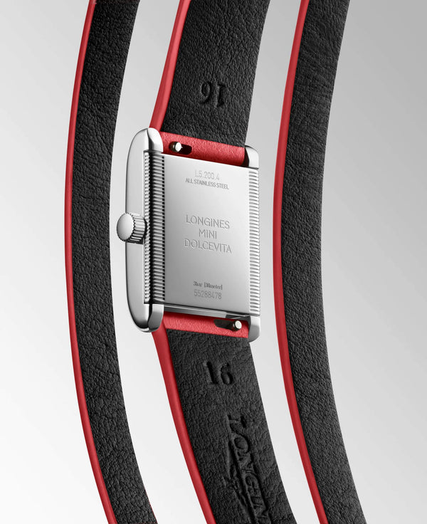 Mini DolceVita系列的所有腕錶都採用了21.50毫米 x 29.00毫米的長方形不鏽鋼錶殼,並搭載高精準度的L718石英機芯。錶殼內的Cosmo圓紋錶盤展現了極致優雅的設計。雙環Nappa皮革錶帶為方型錶殼再添時尚感。