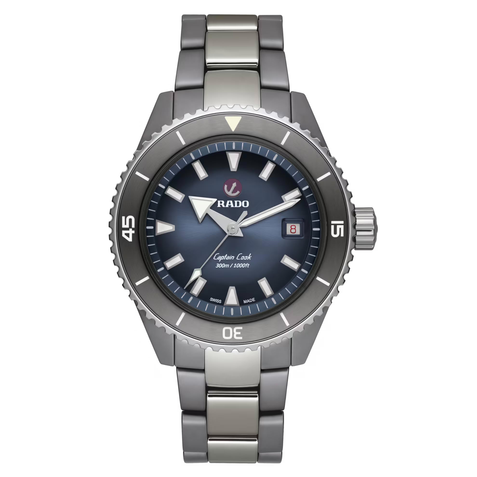 Captain Cook庫克船長高科技陶瓷潛水腕錶的防水性能經ISO 6425認證,深達300米。指針與刻度覆有Super-LumiNova®夜光塗層,與藍色太陽紋飾漆面拋光錶盤形成鮮明對比,確保佩戴者能夠輕鬆讀取時間。整體式構造錶殼直徑43毫米,由啞光等離子高科技陶瓷製成,旋轉錶圈則採用拋光硬化精鋼材質。腕錶搭載Rado R763自動機芯,較標準精準度測試要求超出整整五分,動力儲存長達80小時。這一款式搭配拋光等離子高科技陶瓷錶鏈。無論您的探索領域為何,您的Captain Cook庫克船長高科技陶瓷潛水腕錶都將證明它是個可靠而堅韌,值得長年同行的夥伴。