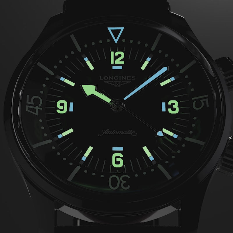 腕錶上的拋光鍍銠箭尖指針覆以Super-LumiNova®夜光塗層,讓腕錶在暗光環境下同樣顯眼。另外,潛水員的圖案印刻在旋入式底蓋上,凸顯了這個系列的獨特風格。