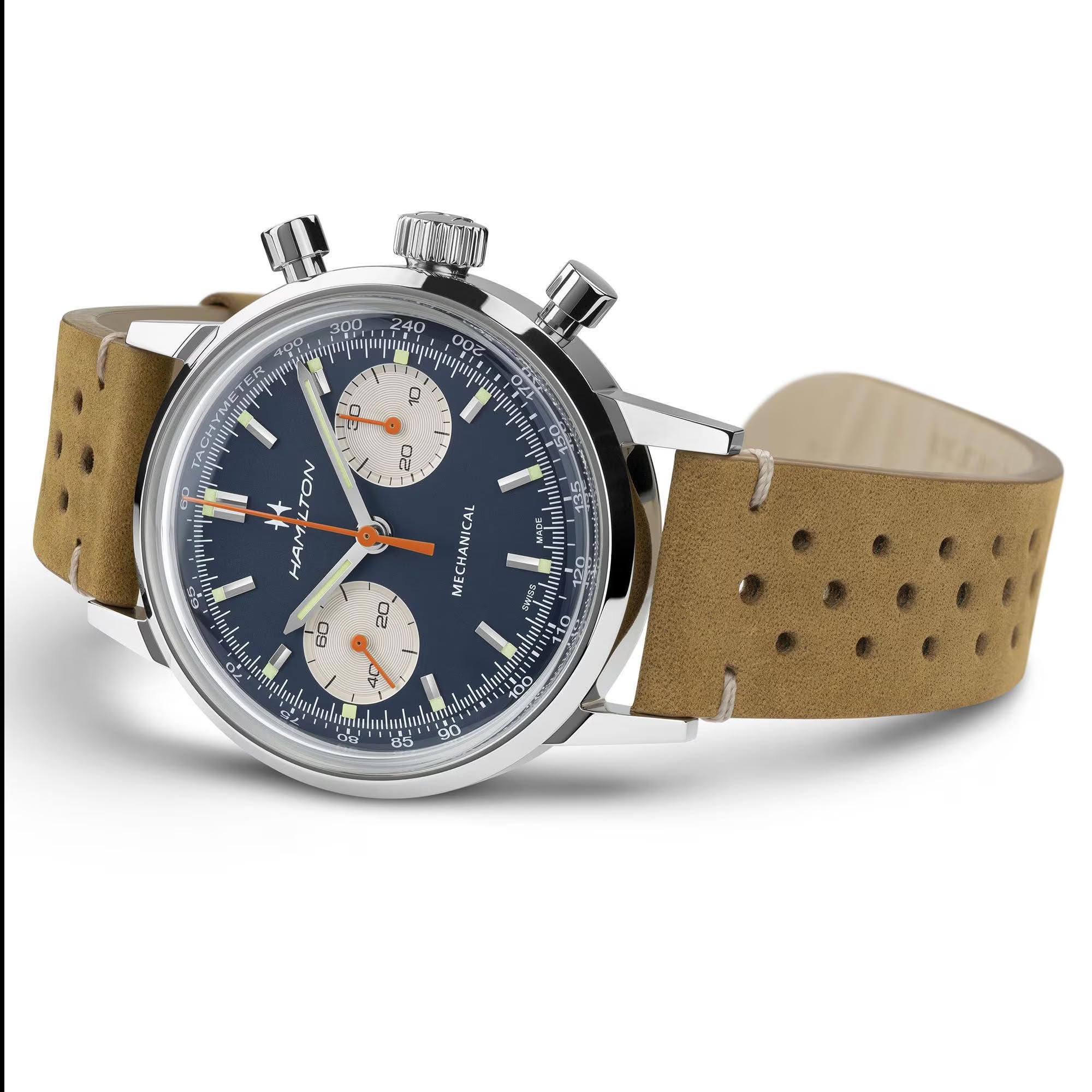 充滿動感又大膽的美國經典系列40毫米計時碼錶,以藍色錶盤搭配橙色計時指針,展現60和70年代賽車文化的澎湃能量。鮮明的色彩組合帶來強烈印象,並以穿孔錶帶營造純正賽車質感。這款自動上鍊計時碼錶專為全速前行之士創製,套裝另附百搭的米蘭鍊帶。