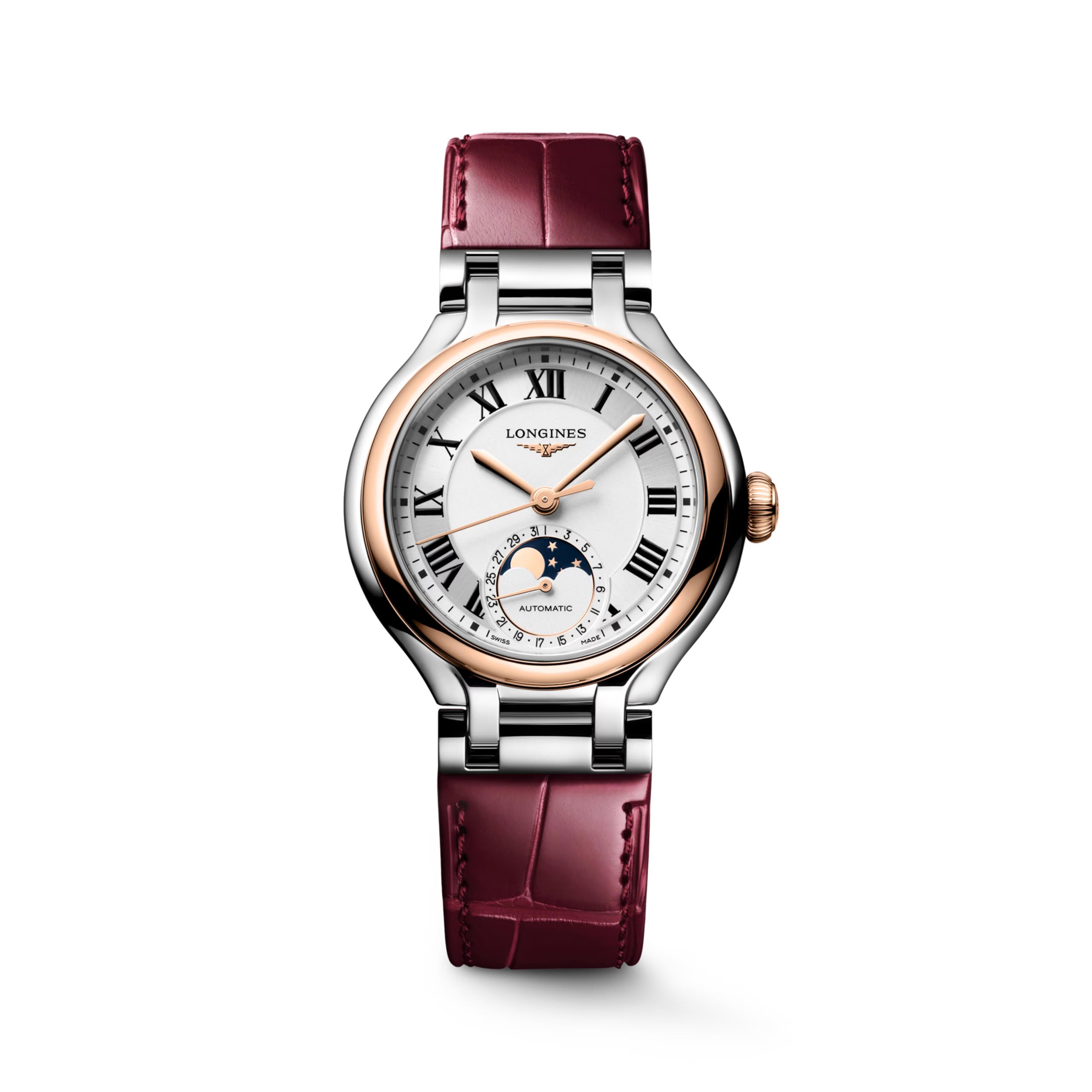 LONGINES 浪琴 PrimaLuna 新月系列羅馬時標月相優雅機械不鏽鋼及18k玫瑰金女錶 34mm L81265712