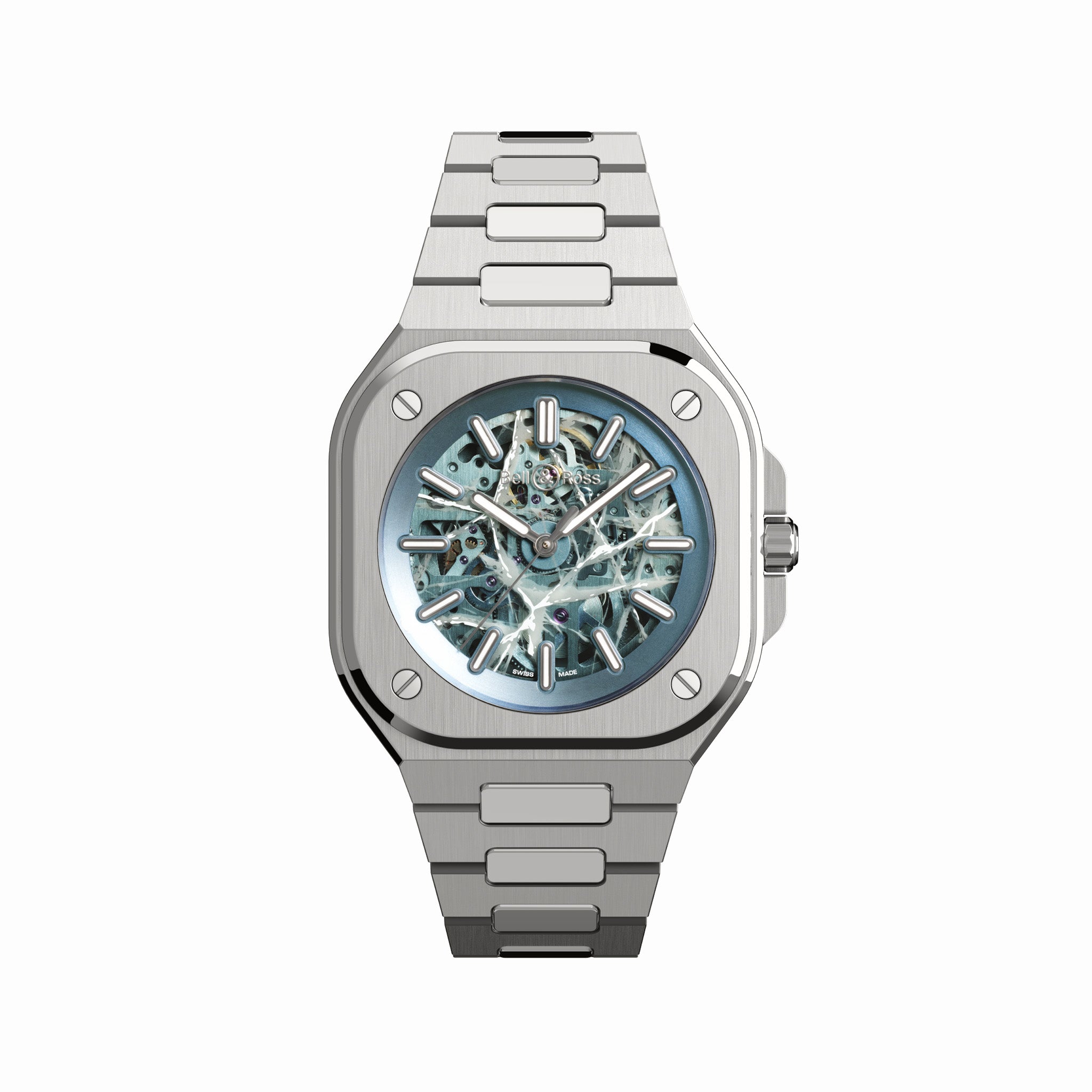 BR-05 Skeleton系列正面迎戰對於腕錶透明度的想像,展現出真正的製錶專業知識。BR-05 Skeleton Arctic Blue這款全新腕錶的錶盤就像似乎是由一塊冰雕刻而成。