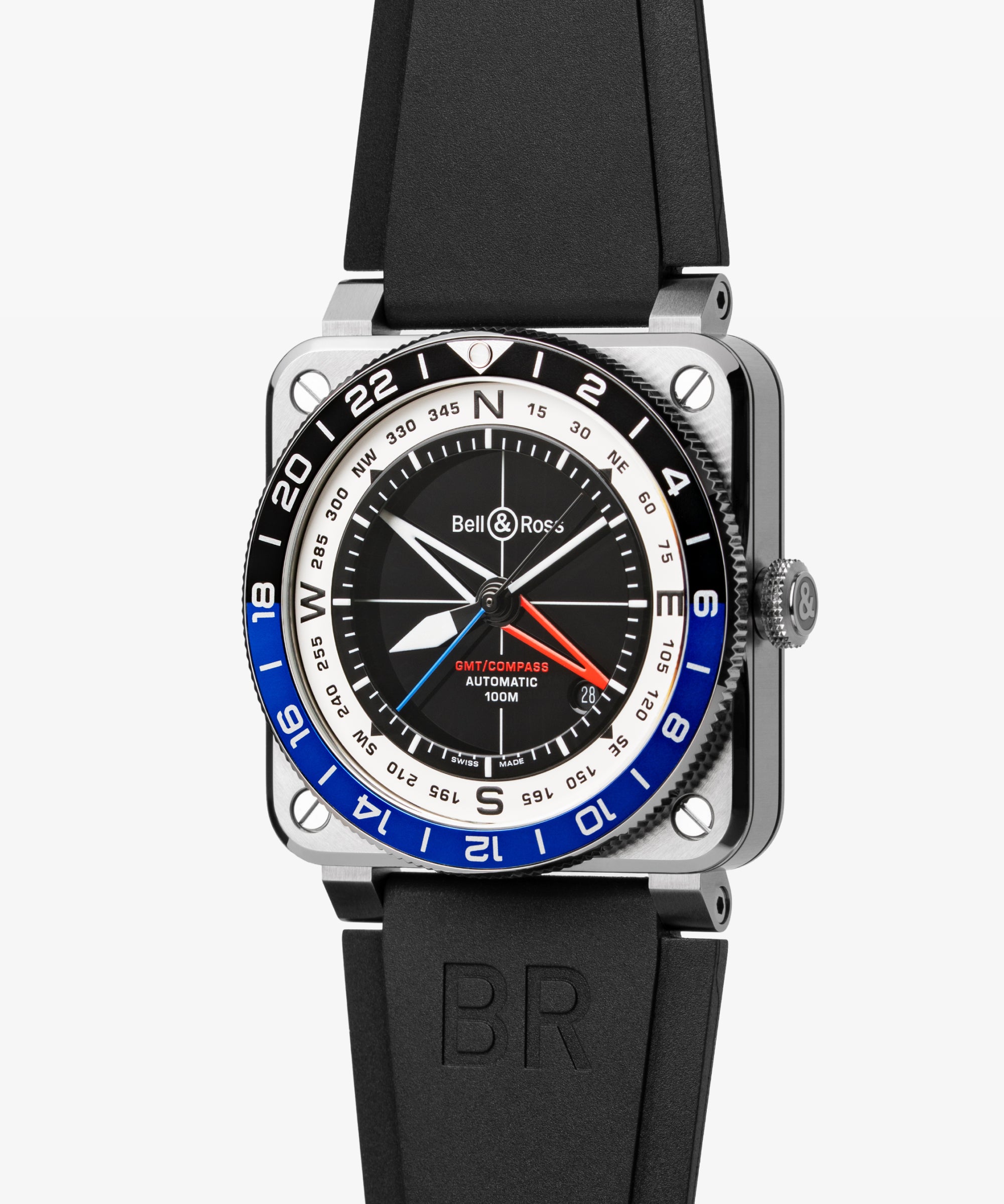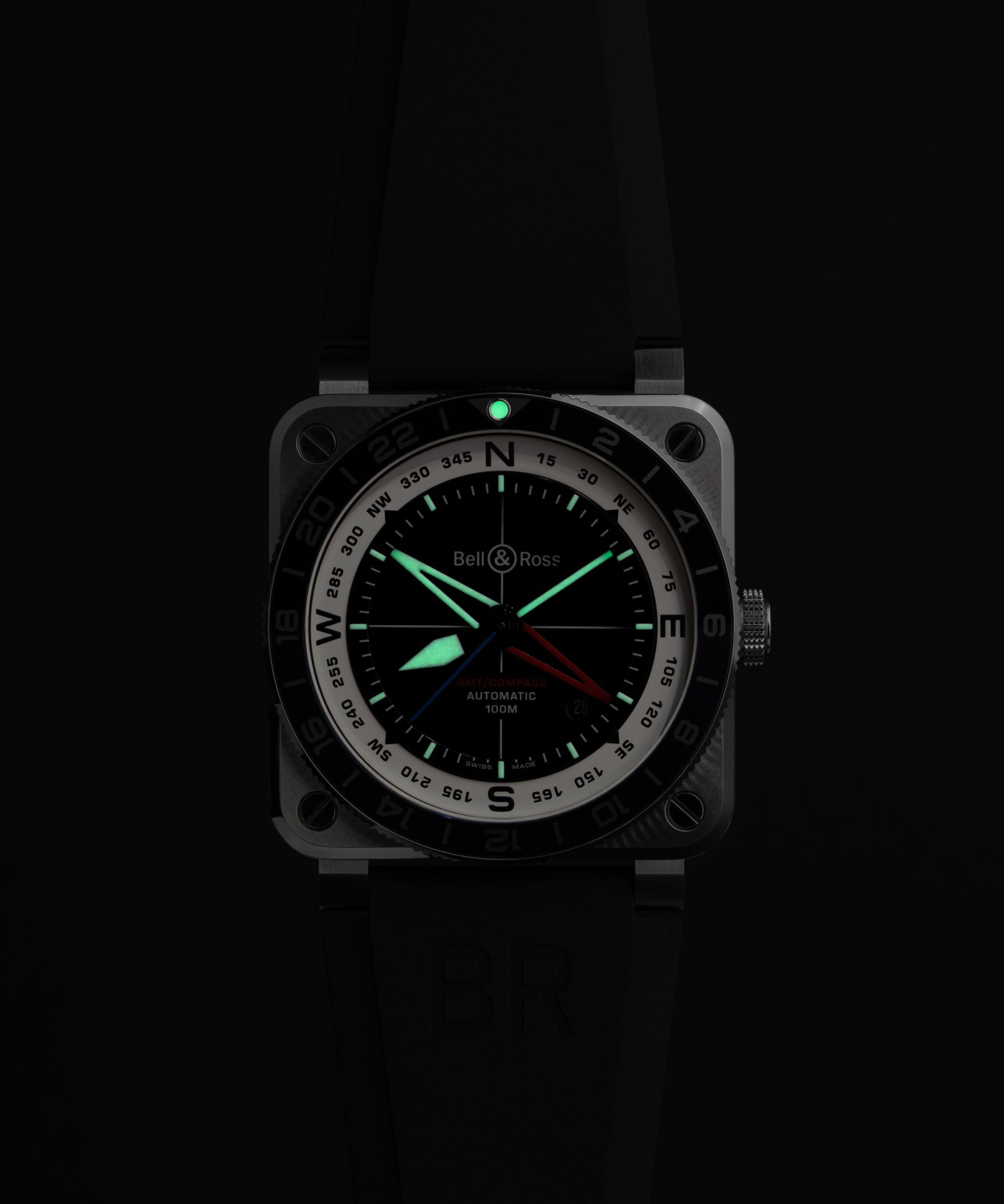 Bell & Ross專為旅人需求而打造的BR-03 GMT Compass將儀器錶推上全新的高度。設計靈感源自磁羅盤,以雙色錶圈和刻度錶盤脫穎而出,不僅可以顯示兩個時區的時間,還可以指示方向。